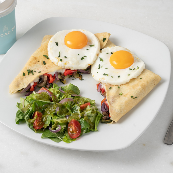 Crêpe rellena de queso suizo, zucchini, cebolla, chile, champiñones rostizados y salsa bechamel, con huevos estrellados encima.