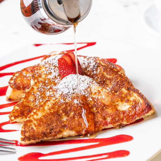 Tostadas a la francesa, al estilo de Cacao 70. Acompañadas de nuestra deliciosa salsa de berries, con tu elección de miel de maple o abeja.